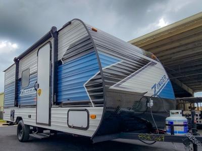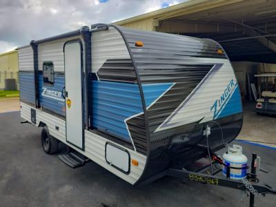 This Zinger Lite travel trailer is perfect for your next family vacation or weekend at the lake with friends. With room for five, this unit gives you the space you need to pack up the kids and the dog and get ready to hit the road! With an RV queen bed and bunk beds, everyone will have a place to sleep. The 38" booth dinette can comfortably hold one to two little ones or an adult guest. Use the two burner range to make a home-cooked meal and easily store your leftovers in the 12V refrigerator. Enjoy extra privacy with a rear corner bath that includes a 30" x 36" shower. This unit features multiple overhead compartments, so bring along the board games and other valuables from home.