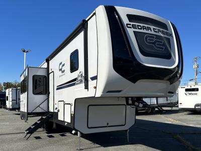 With any Cedar Creek Experience fifth wheel by Forest River, you will bet met with luxury features both inside and out! The True Gelcoat exterior is the best of the best in exteriors and the 3M bonded sidewalls will hold up over years of use. Each model includes Lippert 7,000 lb. axles with ABS brakes, Road Warrior suspension, plus TST tire pressure monitoring system to make towing that much easier. You will also find a 200 watt solar panel outside, along with a heated front storage compartment, a Nautilus P4 multi-function panel with an outside shower, black tank flush, and 12V battery disconnect, plus many more exterior conveniences. The interior will have you feeling like you haven't left home with vinyl floor coverings, Ashley furniture power theater seating, a cozy fireplace, a large bath counter, and the list of comforts goes on! Each model is also pre-wired for satellite to the roof, and you're sure to never go bored with a Smart TV in the living room and an added bedroom TV!