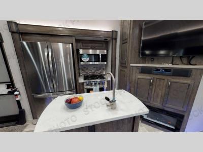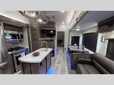 The electric leveling system included makes setting up a breeze allowing you to start having fun sooner. The underbelly armor will protect your unit's vitals from road debris and the painted two-tone aerodynamic fiberglass front cap with improved turning radius will make it easier to maneuver. You'll also enjoy Rich Solar 200W roof mounted solar panel with controller and battery, an on demand tankless water heater, two 15,000 BTU A/C units, and more amenities to make camping hassle-free. And the cook in your group will love the Chef collection 3 burner over with drawer, complete with solid surface countertops, decorative backsplash, and a spacious 12V refrigerator to name a few features.
