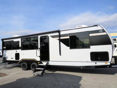 Sleeps 5 Slides 1 Length 34 ft Ext Width 8 ft Ext Height 11 ft 4 in Hitch Weight 875 lbs Dry Weight 6938 lbs Cargo Capacity 2737 lbs Fresh Water Capacity 38 gals Grey Water Capacity 96 gals Black Water Capacity 30 gals Available Beds Custom King Refrigerator Type 12V Refrigerator Size 10.7 cu ft Cooktop Burners 3 Shower Size 36" x 30" Number of Awnings 1 Water Heater Type On Demand Tankless AC BTU 31500 btu TV Info LR TV Awning Info 20' w/LED Lights Axle Count 2 Washer/Dryer Available Yes Shower Type Walk-In Shower Similar Travel Trailer Floorplans